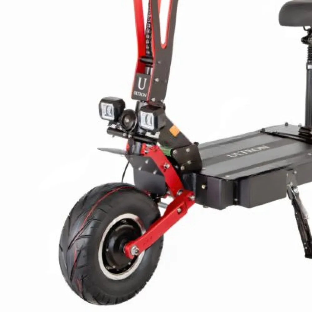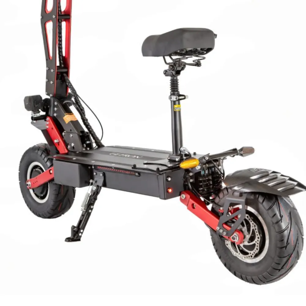 Техника оснащена полным приводом, относится к категории вездеходной. Для электросамоката не станет помехой езда по препятствиям, бездорожью, в ненастную погоду. При полном заряде АКБ транспортное средство с легкостью преодолеет 100 км пути. Чтобы езда была плавной и комфортной производитель предусмотрел гидравлические тормоза и бесшумные контроллеры.